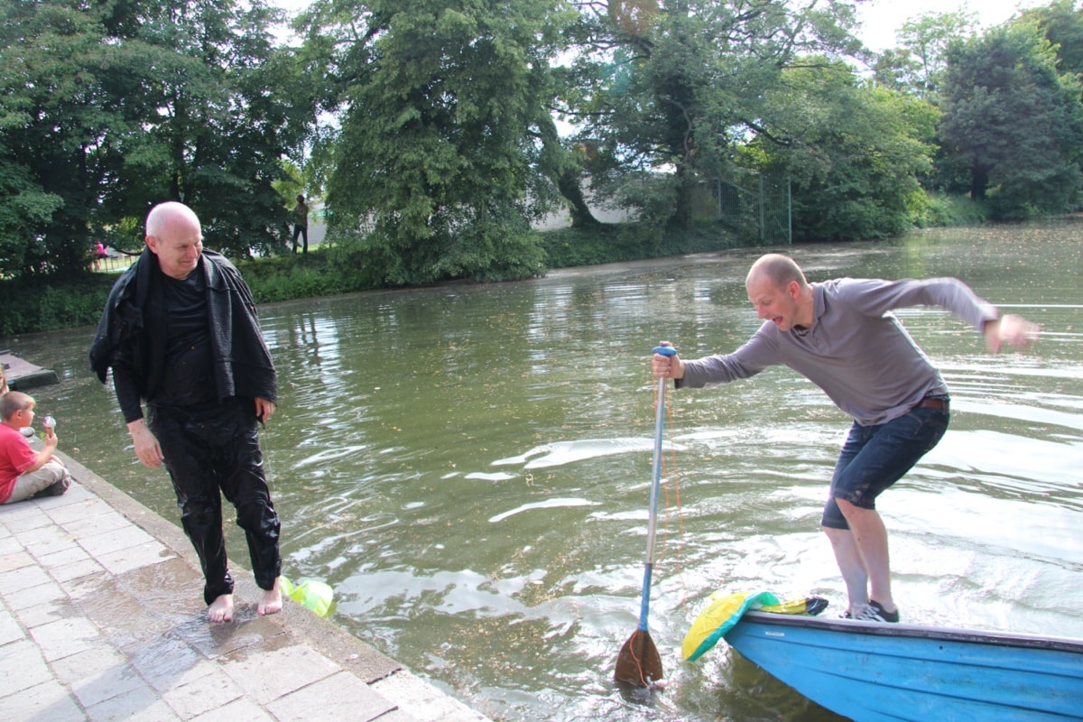performance s Milošem Šejnem/ Dlouhý rybník/ Kroměříž/: duchoprázdno s 1. dimenze demence; 2. intervence z dimenze invence, bezzemce v menze, vehemence